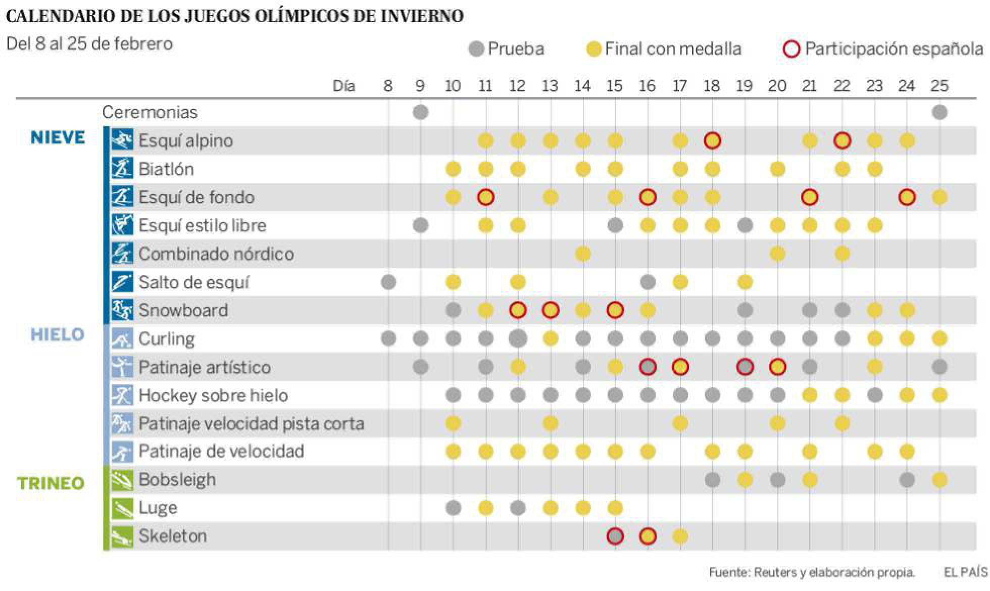 Los juegos olímpicos de Invierno 2018 se están celebrando actualmente en la ciudad de Pyeonchang, ubicada en Corea del Sur. Estos juegos olímpicos engloban un conjunto de deportes que se realizan en climas de bajas temperaturas, es decir, climas fríos. A los deportes jugados en estas olimpiadas se les llaman Ceremonias, las cuales de ejecutan en diversos entornos; en nieve se ejecutan las siguientes ceremonias: Esquí alpino, Biatlón, Esquí de fondo, Esquí estilo libre, Combinado nórdico, Salto de esquí y Snowboard. En hielo se ejecutan el Curling, Patinaje artístico, Hockey sobre hielo, Patinaje velocidad pista corta y Patinaje de velocidad. Por último, en trineo se ejecutan el Bobsleig, Luge y Skeleton. La celebración de estos juegos olímpicos inició con una ceremonia de inauguración el 8 de febrero de 2018 y culminará con una ceremonia de clausura el 25 de febrero de 2018. A continuación se muestra el calendario oficial de los juegos olímpicos de invierno 2018.