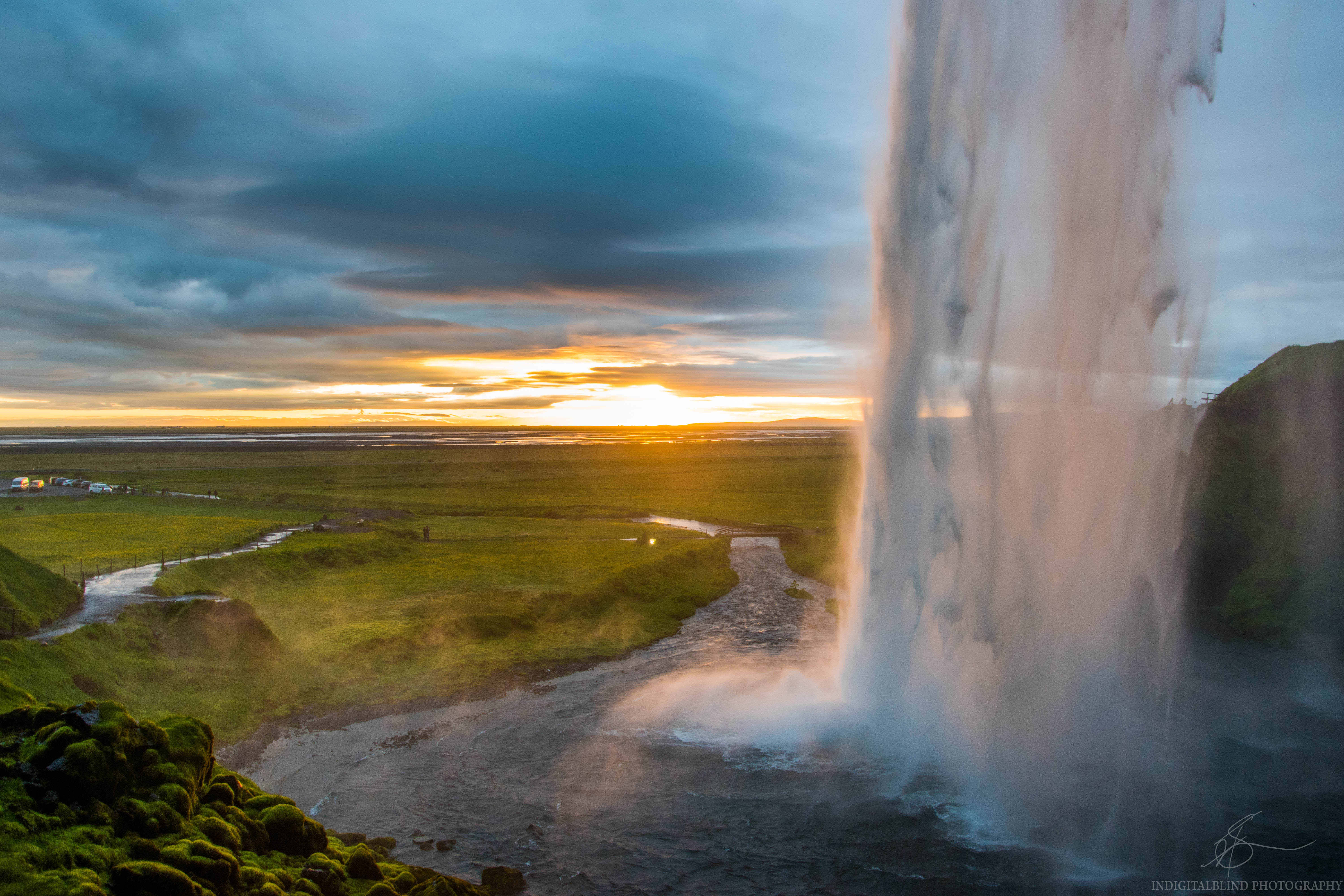 Waterfall in southern Iceland during midnight sunset.