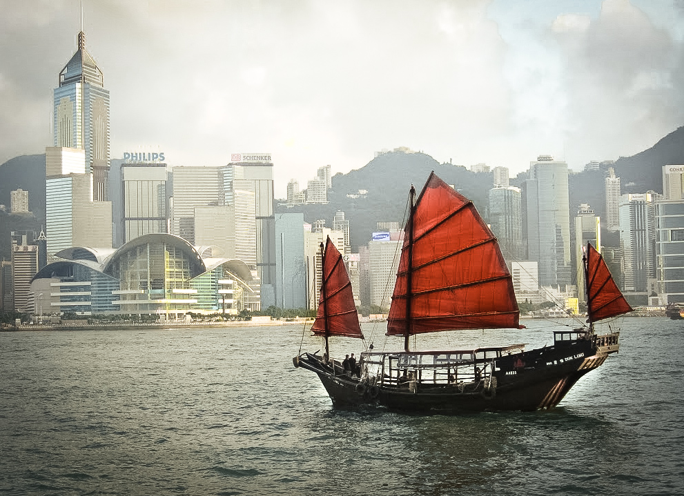 Old meets new in Hong Kong. This is a shot taken from the Tsim Sha Tsui Promenade on a typical smoggy day.
