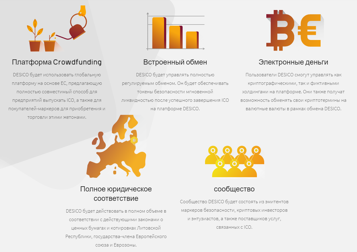 Ключевыми элементами проекта DESICO являются возможности развивать проекты секьюрити ICO и приобретать или продавать секьюрити токены.