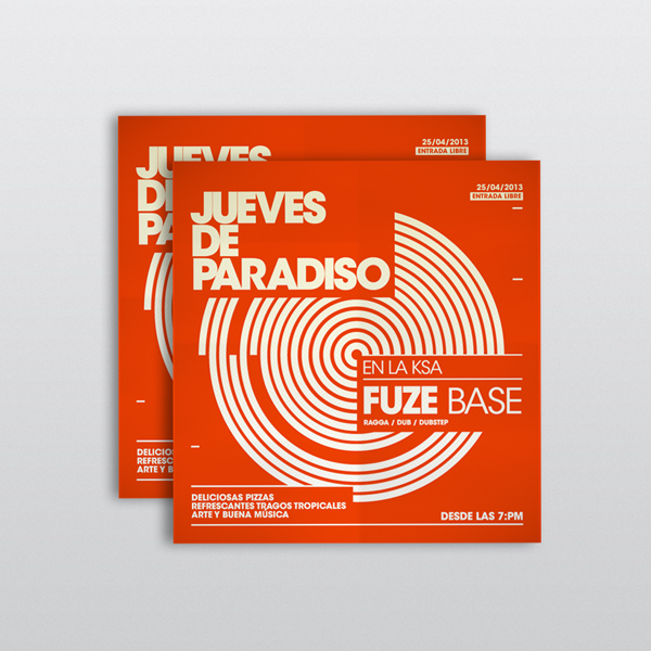 La segunda imagen es otro flyer para la residencia de un Dj en un club local. Esta vez solo diseñé el flyer y disfruté la fiesta. El club era un lugar muy especial (cerró hace un par de años) lleno de árboles y aire fresco; un detale muy peculiar del sitio era a presencia de círculos en toda su arquitectura, muy único, ni cercanemente parecido a nada que haya visto antes, por lo que el concepto detrás del arte fué por supuesto... círculos junto a un color vibrante.