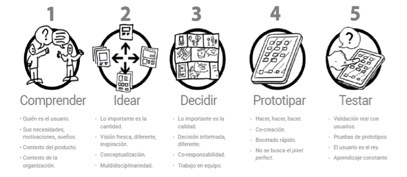 El proceso de Design Thinking lo realizamos por medio de 5 acciones fundamentales: