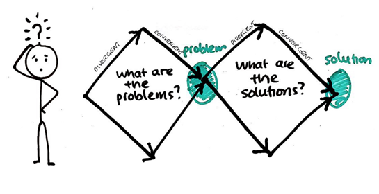 A aplicação do Design Thinking é feita a partir de um conjunto de fases ao longo das quais vão sendo utilizadas técnicas e ferramentas que fazem com que o cérebro alterne entre os modos de pensamento divergente e convergente. A criação de equipas de trabalho mistas e heterogéneas, é fundamental para que possam existir diferentes perspetivas sobre o problema e sobre a solução.