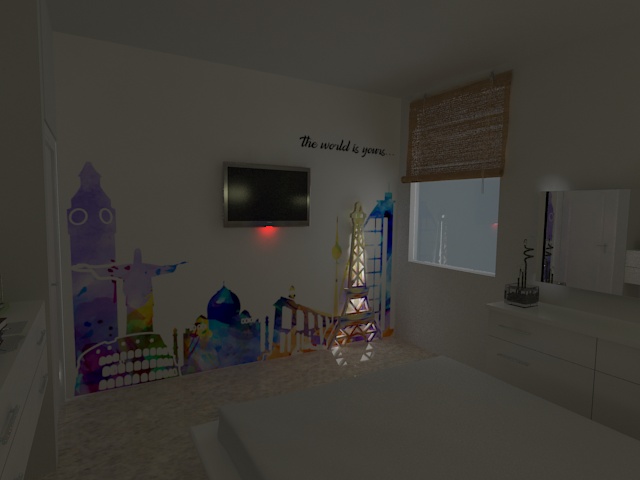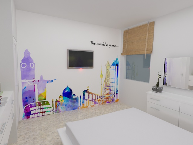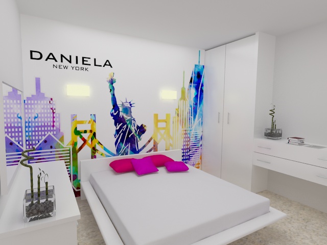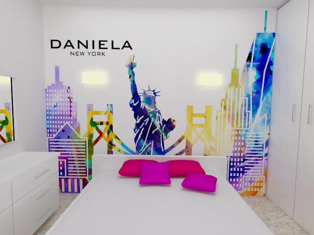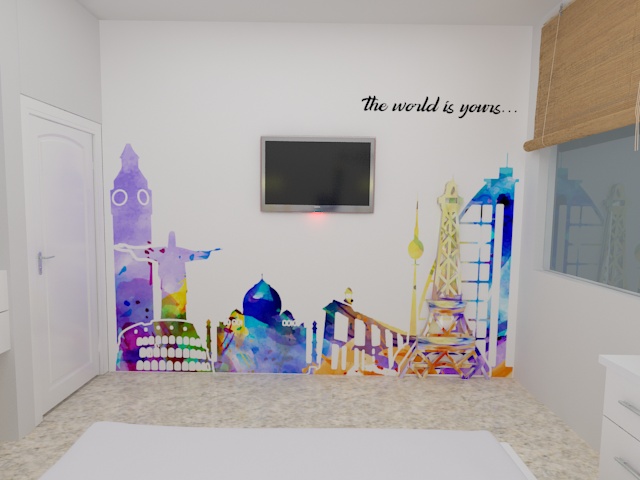 I wanted to give to the bedroom a look for a traveling person, because she wants to travel all around the world (who wouldn´t right?), so I suggest adding in the wall in front of the bed, several iconic buildings from different countries and cities, all around the element that is nowadays present in this wall, her TV.