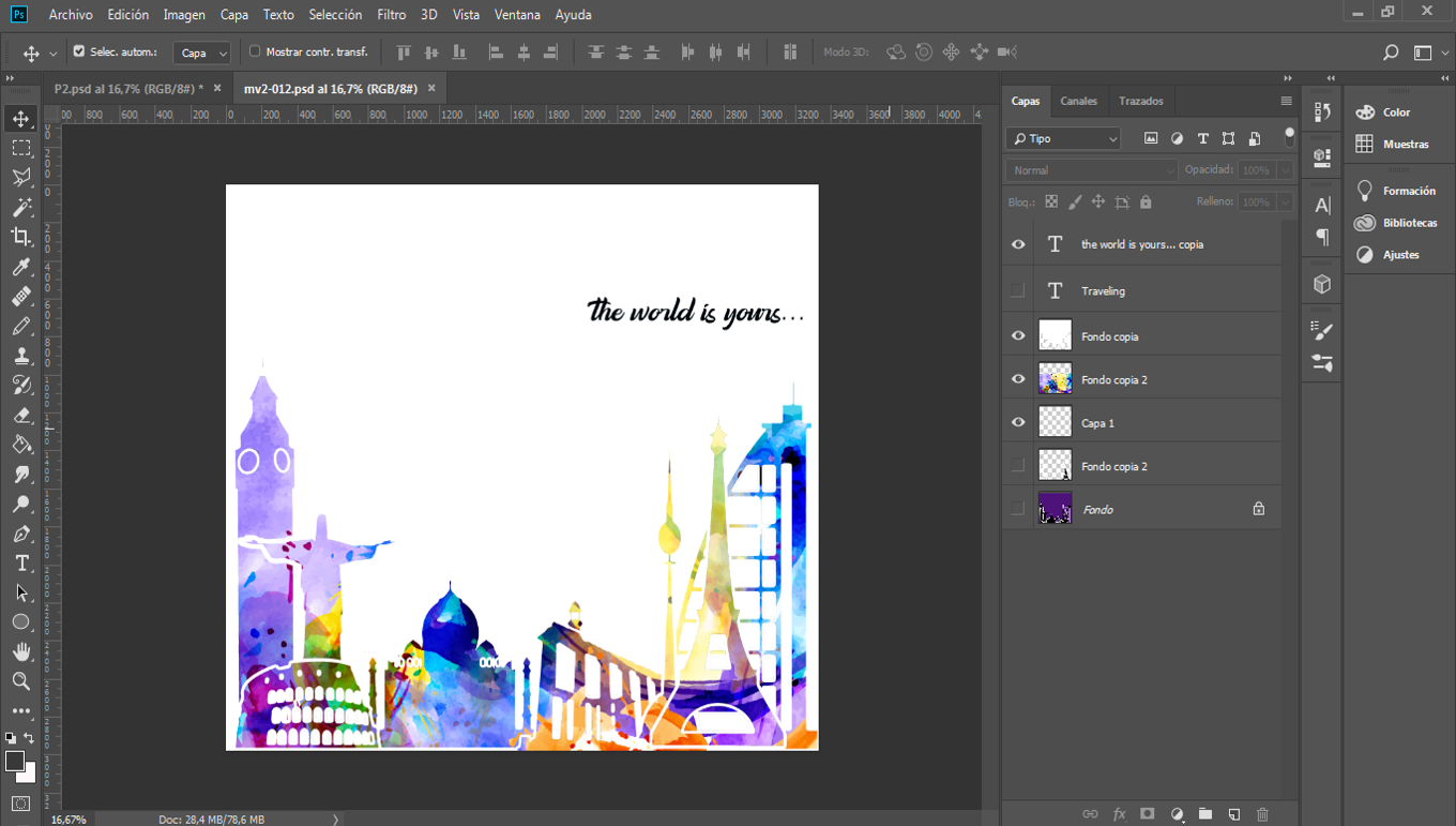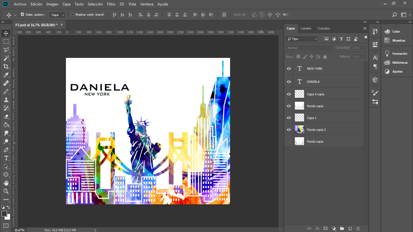 There in Photoshop, I added some more details, like the windows of some buildings, and the text on the top of the wall, the names of my sister-in-law and the city.