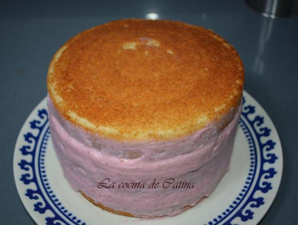 Go up the mold to measures that you place the remaining layers, then place the second cake and cover with another two thirds of strawberry mousse from the other container.