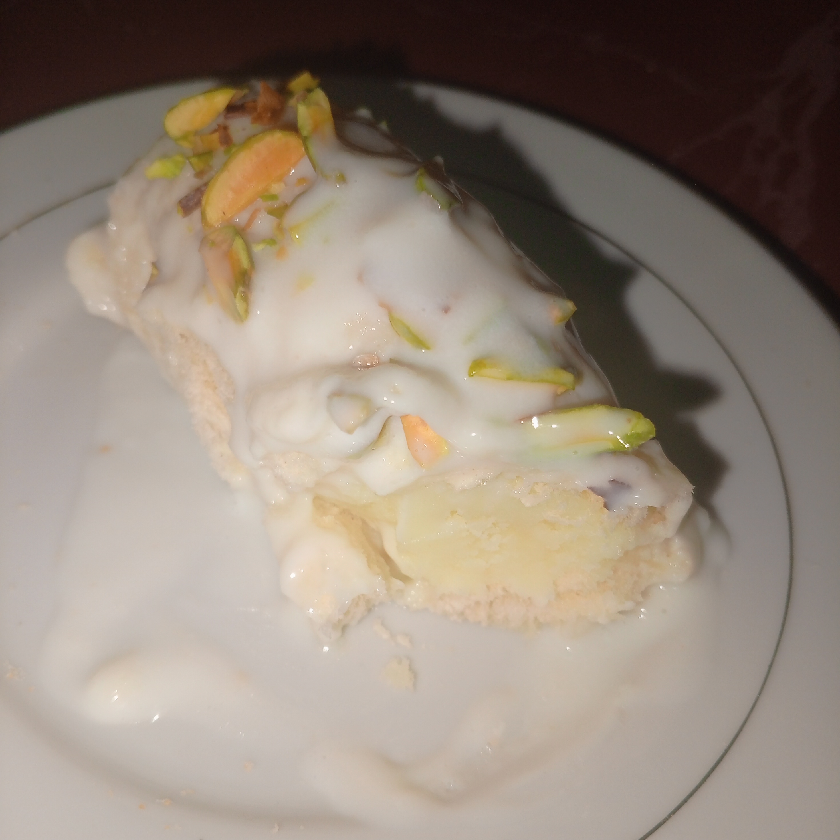 Me gustan las recetas con leche endulzada y saborizada o aromatizada. Disfruté la preparación, es importante que el pan se humedezca bien con el baño de leche. El relleno era delicioso y los tropezones de pistacho le dan un toque muy especial.
