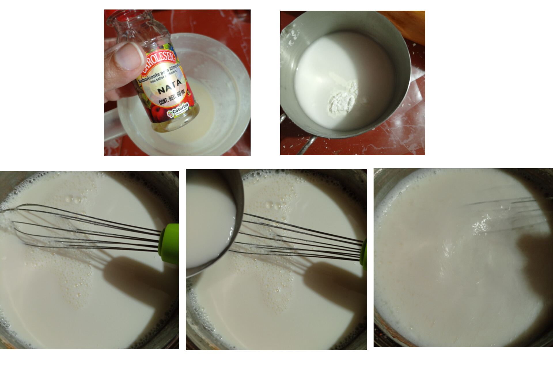 Previamente disolví cucharada y media de Maicena en 1/4 taza de agua y aromaticé la leche con un chorrito de esencia de nata, lo cual no estaba indicado en la receta pero quise añadir ese toque de sabor adicional a la leche.