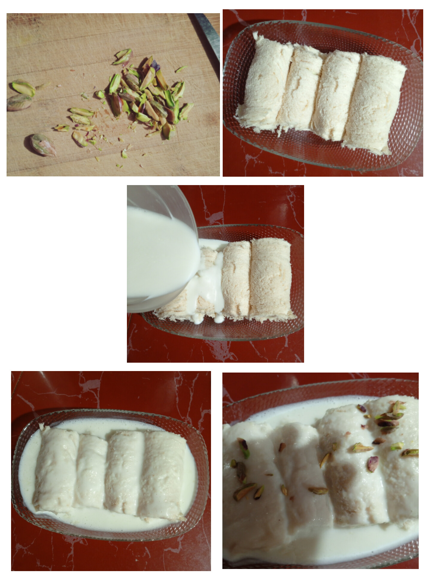 Finalmente, para armar el postre, dispuse los cilindros de pan rellenos en un envase para servir, los bañé con la leche aún tibia y espolvoreé semillas de pistacho que había cortado previamente.