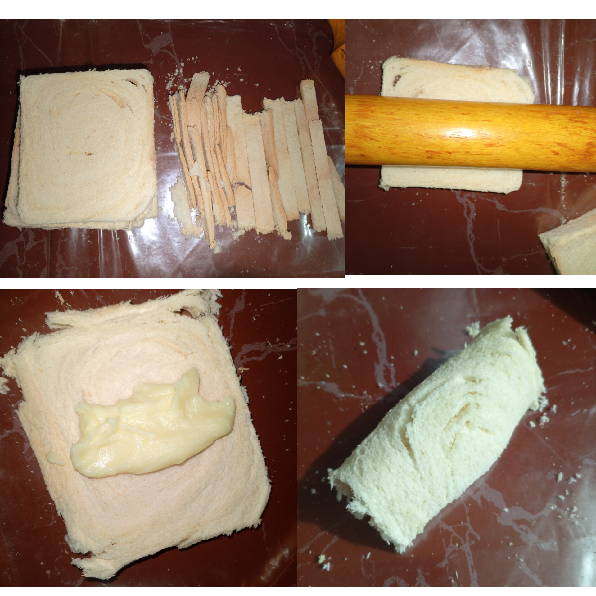 A continuación, tomé las rebanadas de pan, corté los bordes y con un rodillo las fui aplanando, colocando un poco de relleno de forma alargada en el centro del pan y dando forma de cilindro una por una. Reservé.