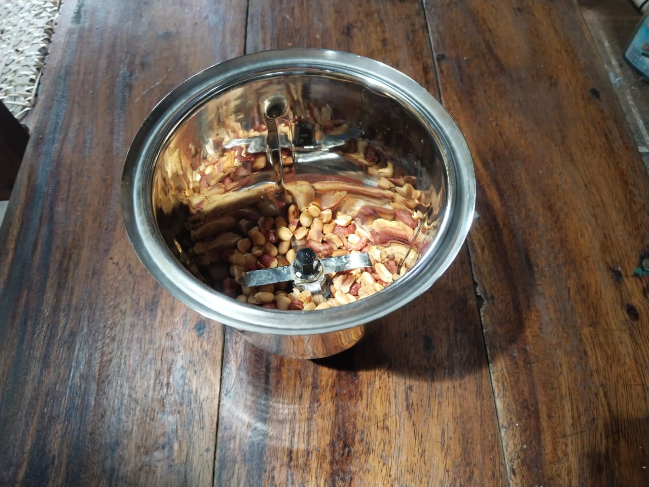 - Then, since you want to blend it, get a blender cup. Add the roasted nuts to the blender cup like this. After adding them to the blender cup, grind them well like this for a while.