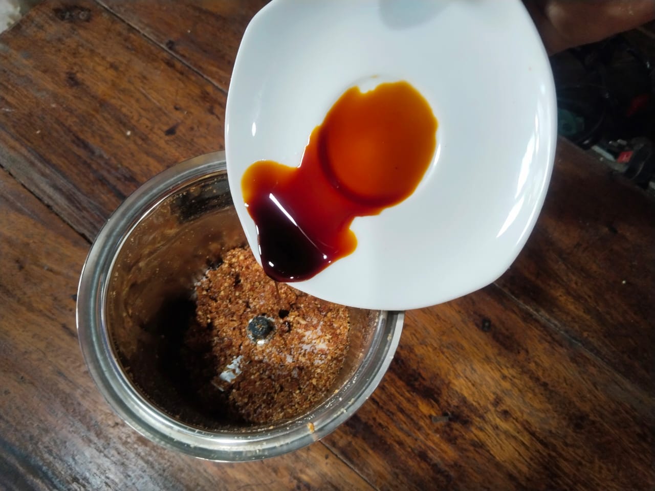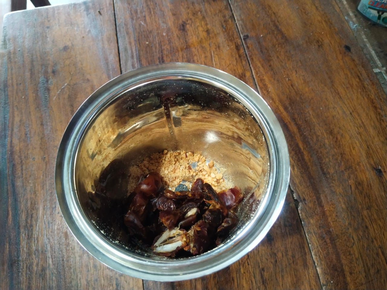 - Then take the dates that you previously pitted. Add them to the blender cup. Then blend the dates well as you did with the Nuts blender.