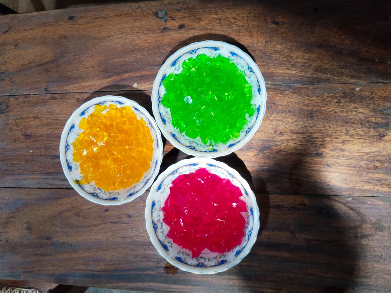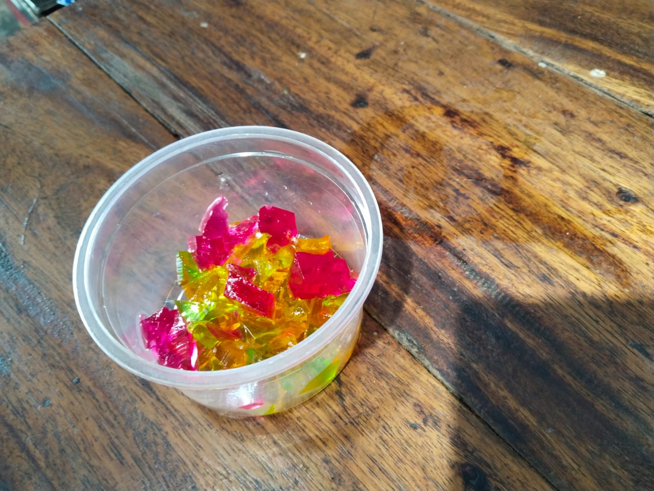 - Now I have prepared the cup I am going to use. So, using that cup, I added jelly pieces in the three colors I prepared like this.