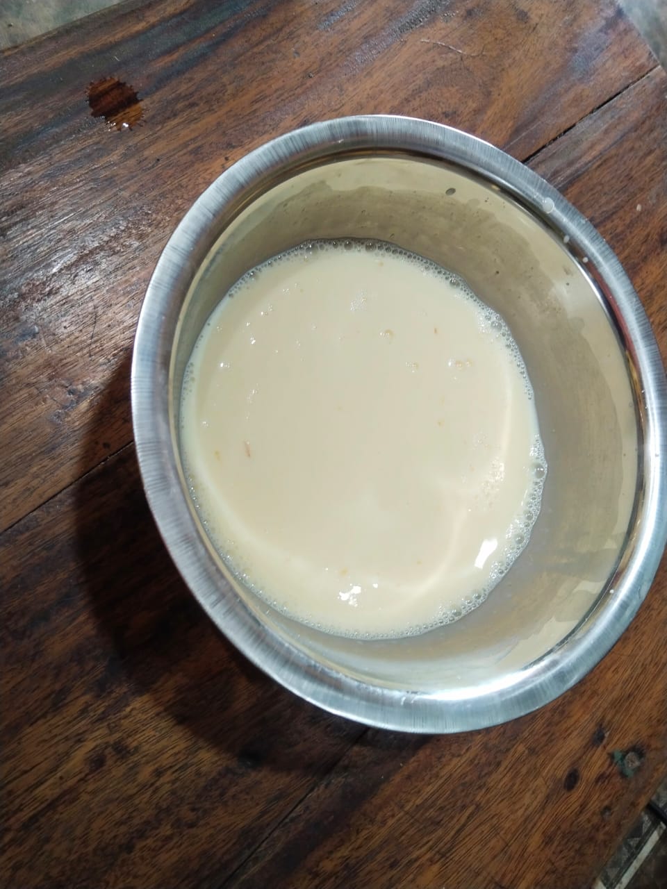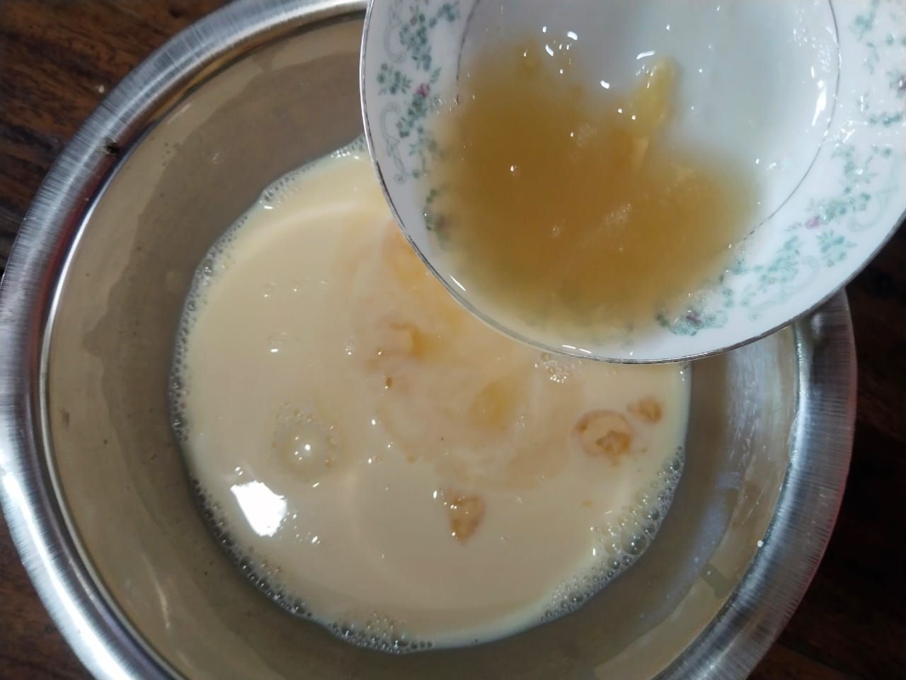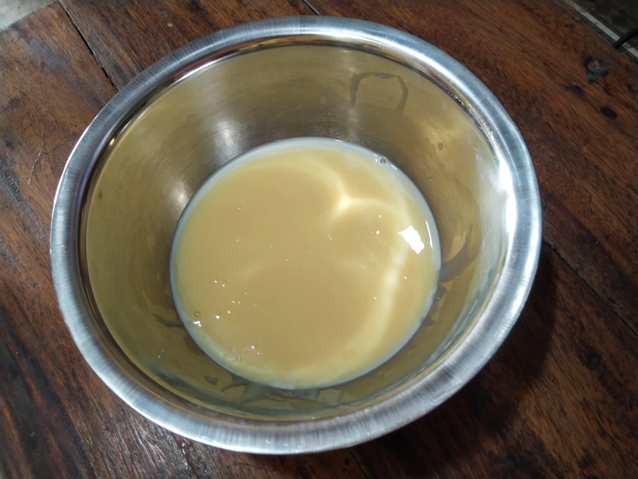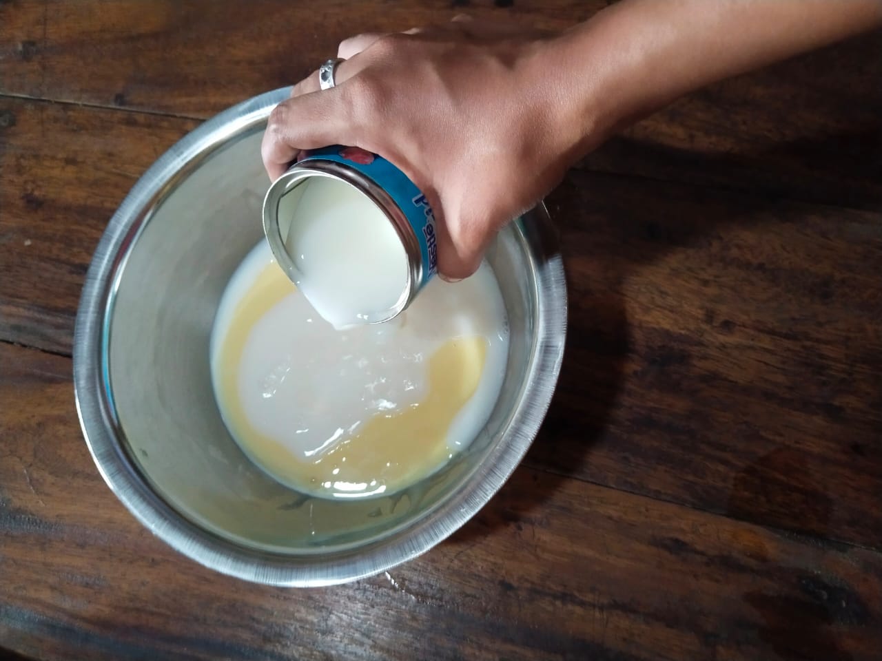 - Now I bought another big bowl. Then I broke the condensed milk can into that bowl and added it to that bowl. I added the condensed milk cans together until they were completely filled with hot water and mixed them well like this.
