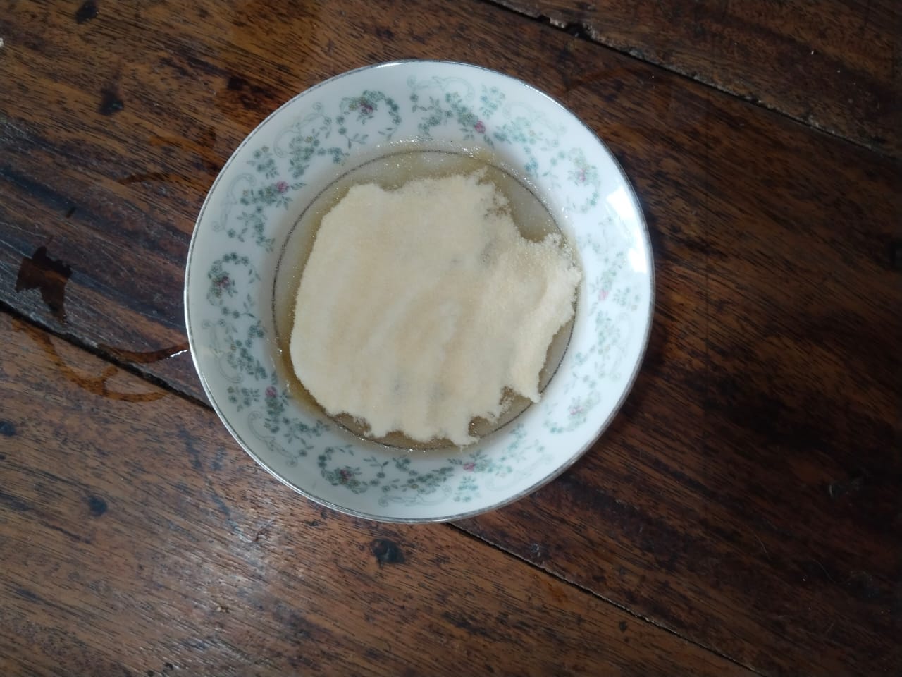 - Then I took another clean bowl. Then I added some water to that bowl. Then I added 20g of gelatin to that water and let it soak for a while.