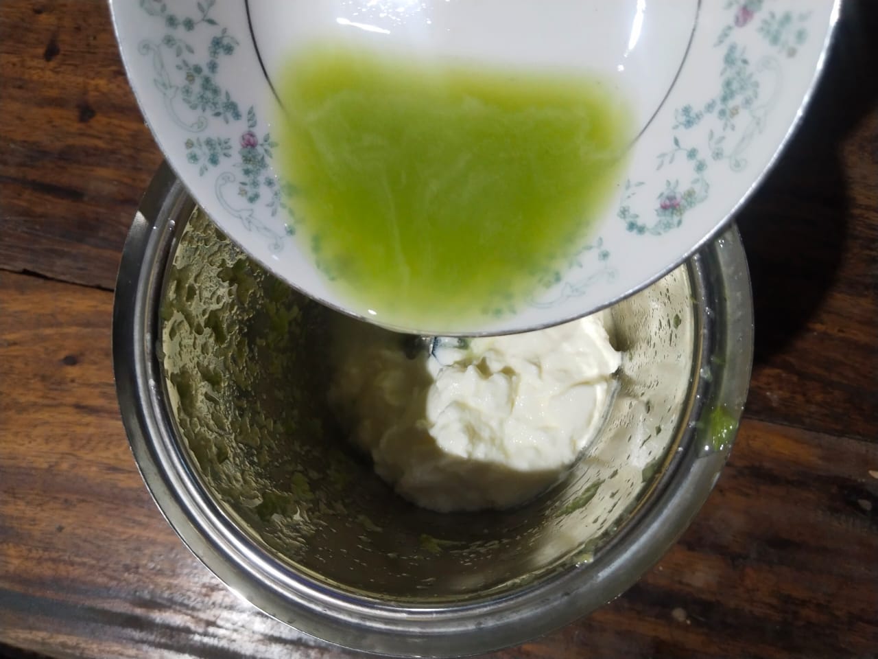 - Then take a clean blender cup again. Add the curd and grape juice to the blender cup like this. Add all of them to the blender cup.
