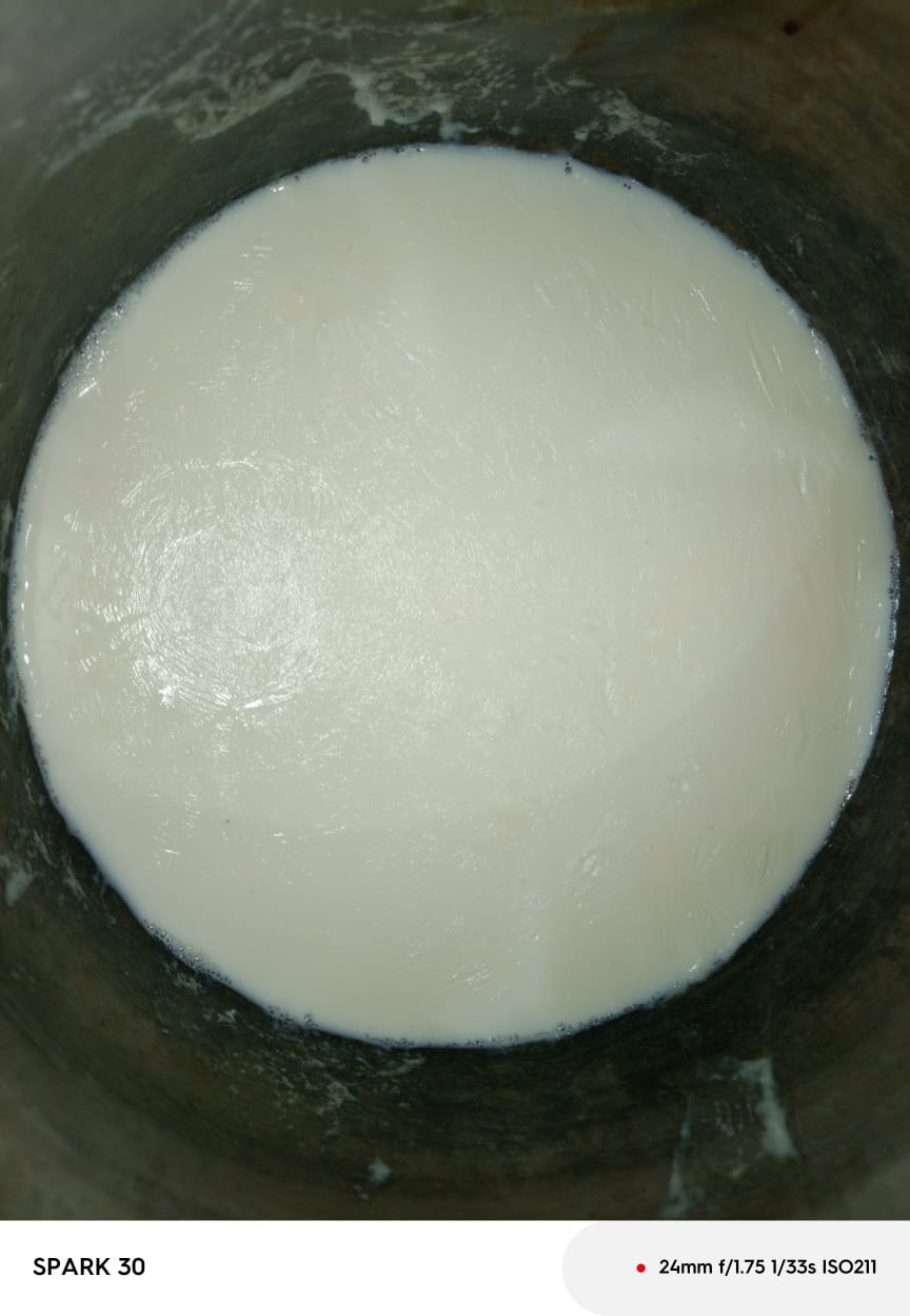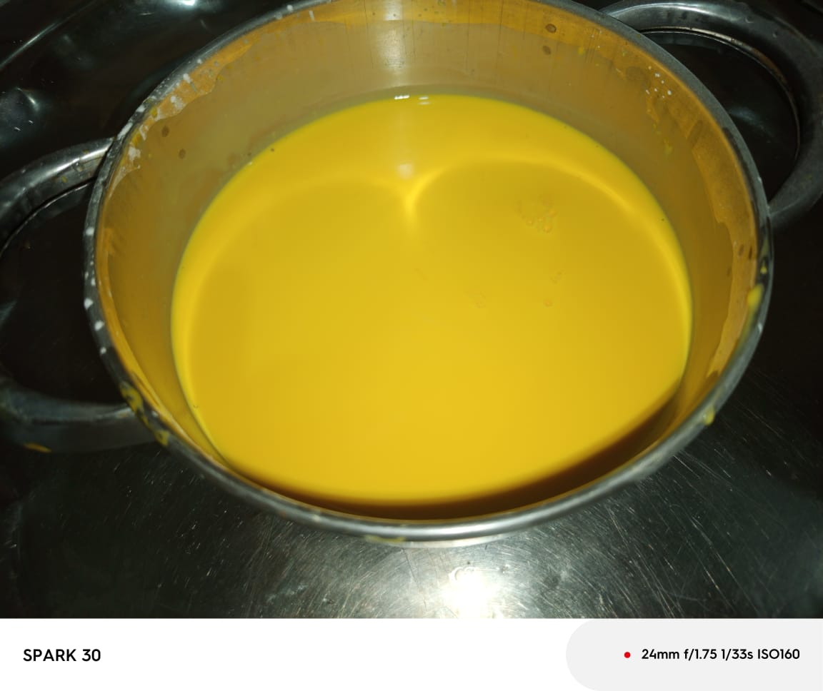 ➡️ Now in this step, I boiled the milk, and after boiling it for a while, I then put the pot of milk aside. Now I took a separate container and in this container I poured some milk separately and then I added 4 Tablespoons of Mango custard powder and then mixed it well.