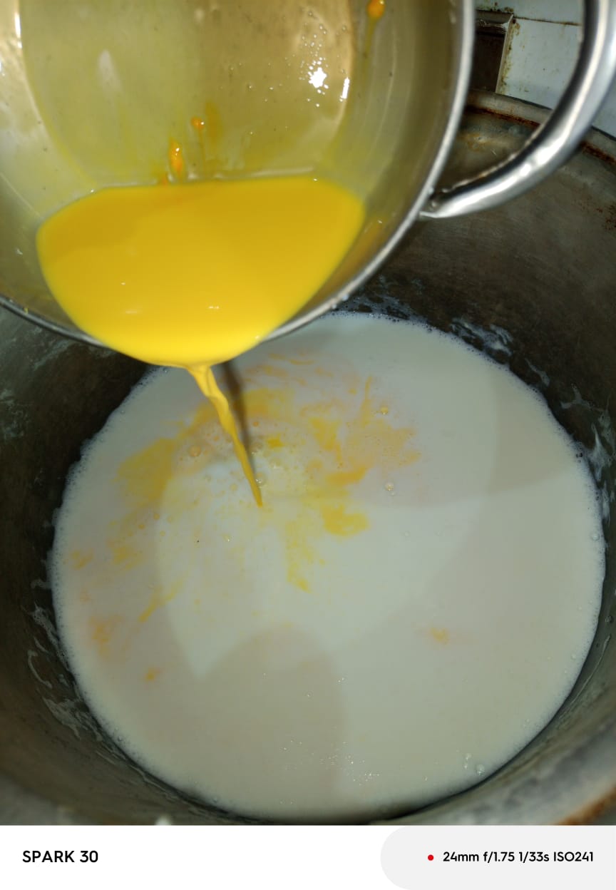 ➡️ Now in this step, I poured the mixture I made from the milk and custard powder, I added this mixture into the boiled milk. And then I add 4 tablespoons of sugar to it, and then I mix it very well. I continue stirring to avoid lumps.