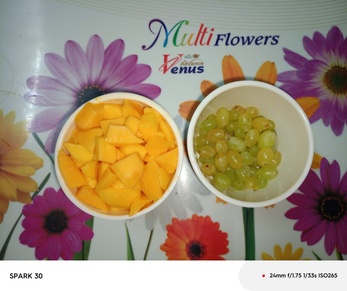 ➡️ Now in the second step, I took one of my favourite summer fruits, which is Mango, first I peeled its skin and then I chopped it into small pieces. And after that, I removed the small stems from the grapes, and then I kept both of these fruits in separate bowls.