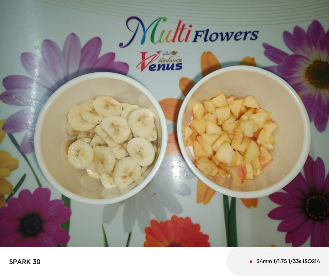 ➡️ First, I went to the market and bought all the necessary ingredients that were going to be used. After buying it, I washed all the fruits properly, and after washing them, I then chopped the bananas into small pieces, and after chopping them, I then chopped the apple and then kept both of them in separate bowls.