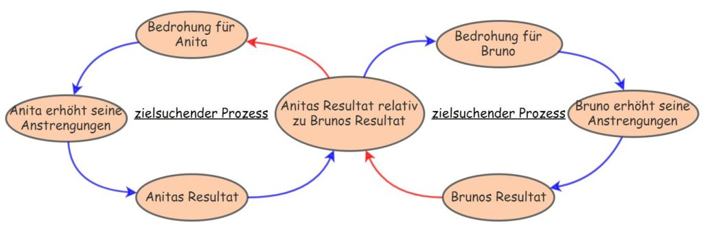 Warrens Definition, wonach ein Archetypus ein generisches CLD, zusammen mit einer speziellen Verhaltensstory sei, finde ich bestechend handlich. Gerade an ihrer Verhaltensstory können die beiden Archetypen - "Eroding Goal" und "Escalation" - sehr eindeutig voneinander unterschieden werden. Das fängt schon nur bei der Tatsache an, dass in "Eroding Goal" bloss eine Partei in gewissem Sinne gegen sich selbst handelt, während es in "Eskalation" zwei Parteien gibt, deren Handlungen sich an denjenigen des Gegners orientieren.