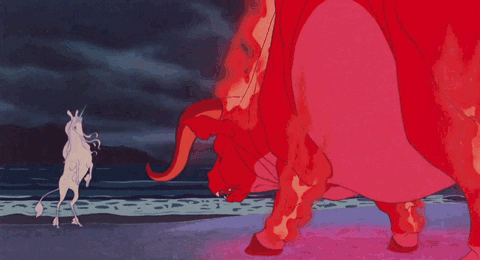 Like in the story of The Last Unicorn, where she is being driven into the sea by the Red Bull, where he has already driven and trapped all the other unicorns, and is about to do the same to her, she has no choice but to face her fear or be trapped just like all the others, the end. So she turns and faces the fear of conflict flaming and menacing before her, despite her fears and doubts, and the doubts of others that she has any chance against what seems to be impossible, and she drives the bull into the sea, and in this sets herself and all the others free. Cause what we correct and change in ourselves, we do for all of us as well. Some really specific symbolism there.