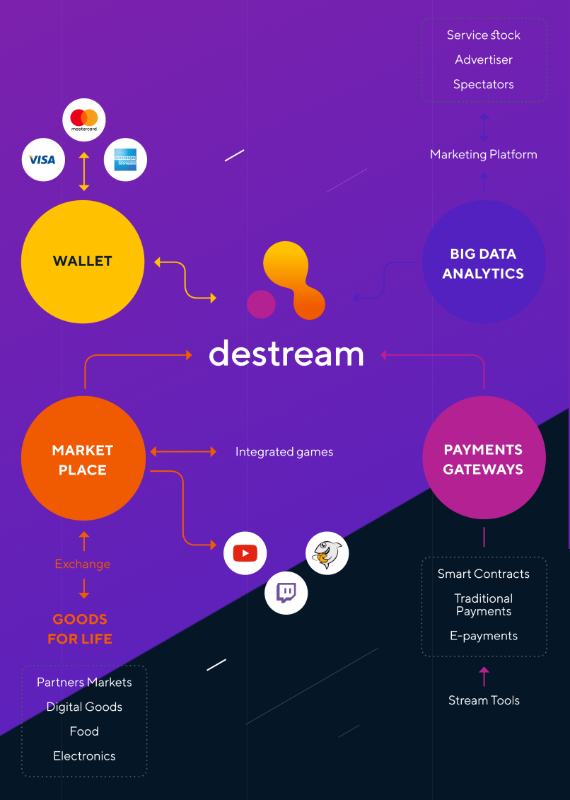 DeStream is the first decentralized global financial ecosystem for streamers. The main aim of project DeStream is establishing a decentralized global platform for the streaming market that will allow maximizing the productivity of streamers, diversifying their activities and securing start-up capital. We are establishing an innovative platform that will act as an ecosystem for streamers. The use of blockchain technology will allow us to reduce transaction fees by more than twofold. Decentralization will allow us to exclude payment systems from the process and reduce numerous transactions costs. Thus, we will improve the quality of the content and the streamers will be allowed to focus on creation, instead of operational activities.