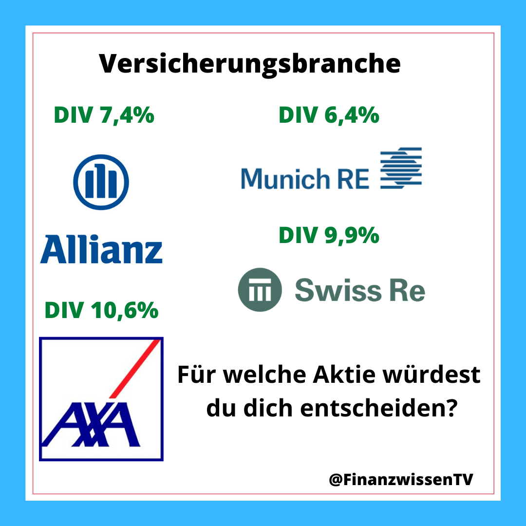 Bei den Dividenden weis man natürlich aktuell nicht ob sie gesenkt oder gestrichen werden. Aber wer langfristig denkt kann hier gut einsteigen. Und sich hier trz. eine gute Dividendenrendite holen. Ist natürlich keine Anlageberatung. Ich selber möchte mir auch im Bereich Versicherung etwas in mein Depot legen. Vermutlich wird es die Allianz. Aber um genaueres zu sagen muss man das nochmal genau Analysieren. Es gibt auf der Welt auch noch einige andere Aktien, ein blick auf die USA wird bestimmt auch nicht schaden. In meinem Depot habe ich schon viele Aktien aus den USA deswegen tendiere ich zur Allianz.