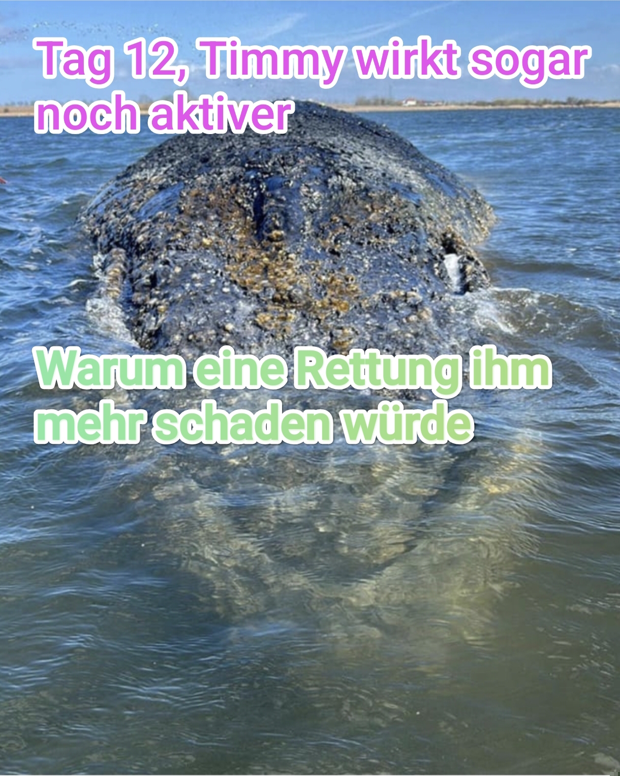 Dem Wal Ruhe zu geben in einer großen Absperrzone. Ihn in Ruhe sterben zu lassen. Überraschenderweise ist Timmy heute am 12. Tag mehr aktiv als die letzten Tage. Er bläst öfters, ca. alle 5 Minuten und brummt auch mehr. Er zeigt, dass er nicht sterben will, er kämpft. Das macht die Tragödie für mich umso grausamer. Timmy ist ein junger Wal, er ist nicht älter als 5 Jahre. Buckelwale werden in der Regel 80 bis 90 Jahre alt, er hätte noch sein ganzes Leben vor sich.