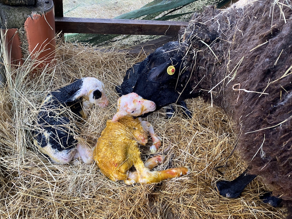 Das Mutterschaf trocknete beide Lämmchen. Ich holte ein Gatter, um die kleine Familie einzupferchen - zwei bis drei Tage sollten sie schon alleine sein, denn irgendein Schaf kann immer mal unbedacht auf fremden Nachwuchs treten.