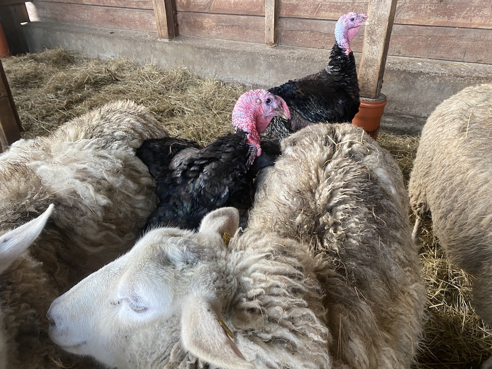 Jo, das sind Puten. Die Biester laufen frei herum. Wenn die Schafe gefüttert werden, sind sie pünktlich in den Ställen. Picken das Schaffutter und sparen sich ihre eigenen Körner im ganz offensichtlich überwindbaren Geflügelgehege für den Rest des Tages... 😉