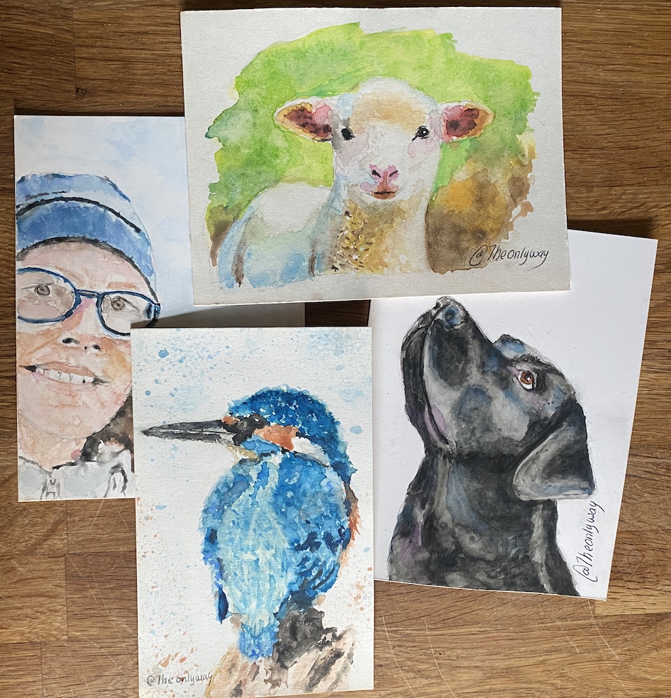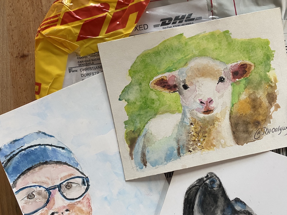 Am Samstag, den 7. Mai 2022 dann die Erlösung: Ich erhielt eine Sendung - geöffnet beim Zoll, nach Nichtauffinden von Drogen notdürftig verklebt - aus der mich zunächst vier postkartengroße Aquarelle anlachten: der schwarze Labrador, ein Schäfchen (¡Gracias por seguir mis textos sobre ovejas y mi nuevo amor por los animales lanudos también!), das Porträt von mir und als Überraschung ein wunderschöner Eisvogel.