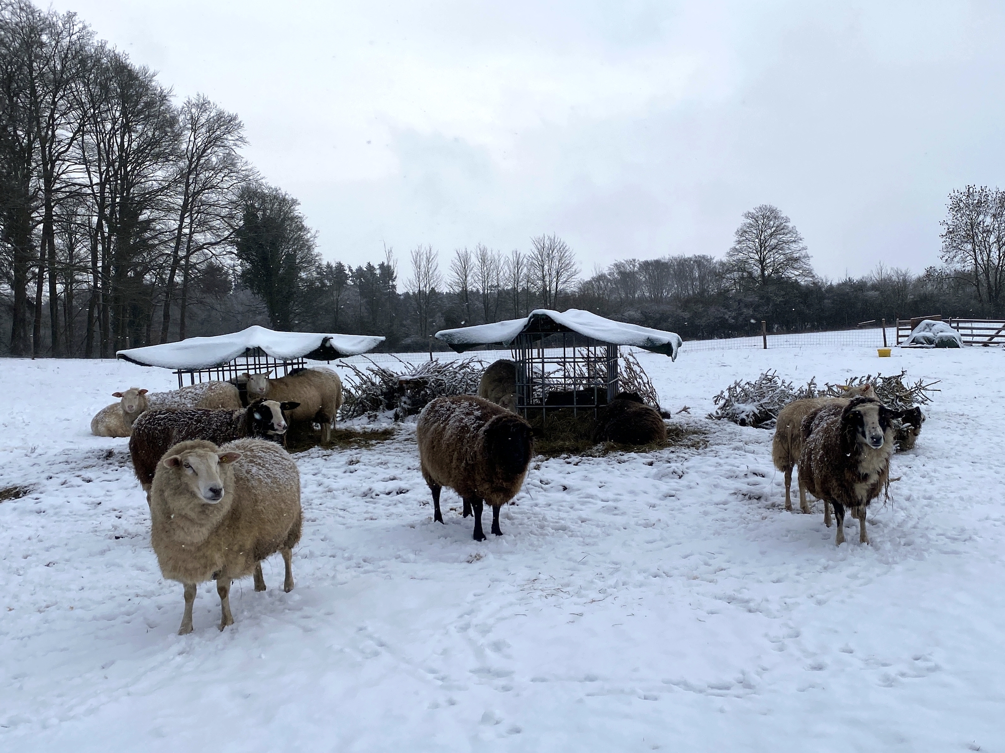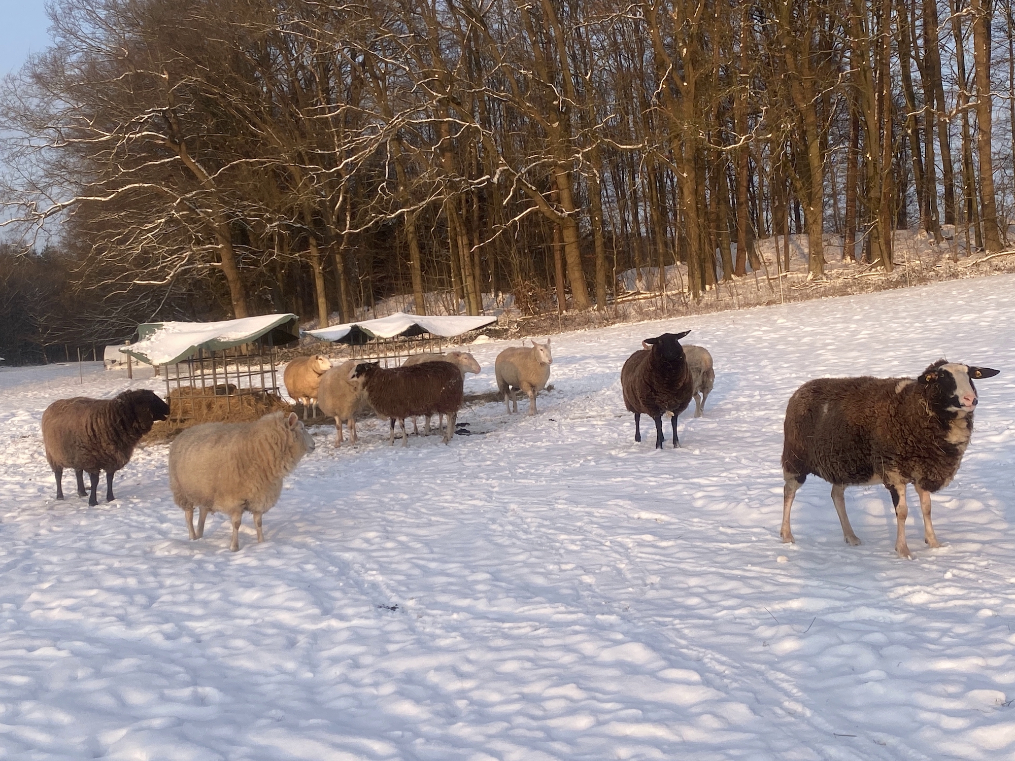 Nein, die "armen" Schäfchen schlafen nicht im Stall. Sie könnten, wenn sie wollten. Sie wollen aber offensichtlich nicht. Der große Vorteil an dieser Wetterlage ist, dass wir immer sehen können, wo die Süßen geschlafen haben.