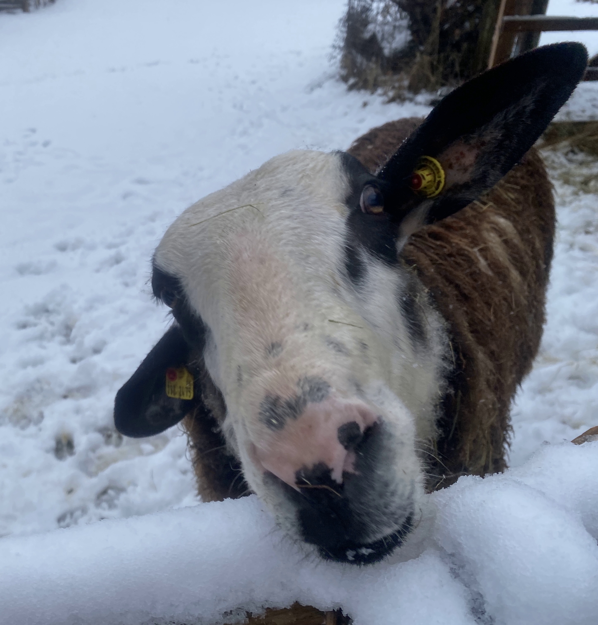 Das weiß auch "der Alte", Papa Elton, zu schätzen. Ganz, ganz schnell stand er am Gatter als es hieß "Wer kommt mit?" Und ehrlich gesagt gehört der arme Kerl im Winter auch auf die Pflegestation: zum einen hat er diesen chronischen Klauenschmerz. Ein Symptom der Blauzungenkrankheit, die uns im Sommer 2024 betroffen hat, ist eine Kronensaumentzündung. Die hat Elton mitgenommen; sie hat dazu geführt, dass ihm an einer Sohle keine feste Hornhaut mehr wächst, sondern eher eine von der Stärke, die wir von unseren eigenen Fersen kennen. Zu dünn! Eltons Sohle klebt am Eis fest und reißt auf. Aua! Noch viel schlimmer: "Was ist denn das jetzt für eine Blutlache?" - Elton hat sich wegen seiner Klauenschmerzen angewöhnt, im Kniestand zu grasen. Dabei schubbert die Brust auf dem Boden, so dass er dort keine Haare mehr hat. Auf dem vereisten Boden ist seine Brusthaut kleben geblieben!