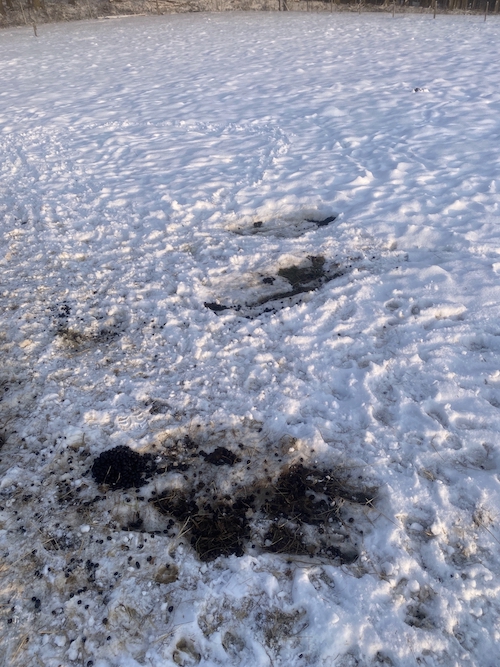 Der winterliche Alltag scheint sehr eintönig zu sein. Die Spuren im Schnee weisen darauf hin, dass die Damen und Herren stets nur kurze (und immer dieselben) Wege auf sich nehmen: von der Heuraufe zum Wasser, vom Wasser zur Raufe, vereinzelte (abenteuerlustige?) Tiere gehen mal zum Stall, aber das war's dann auch. Energie sparen, bloß nicht zu viel bewegen!
