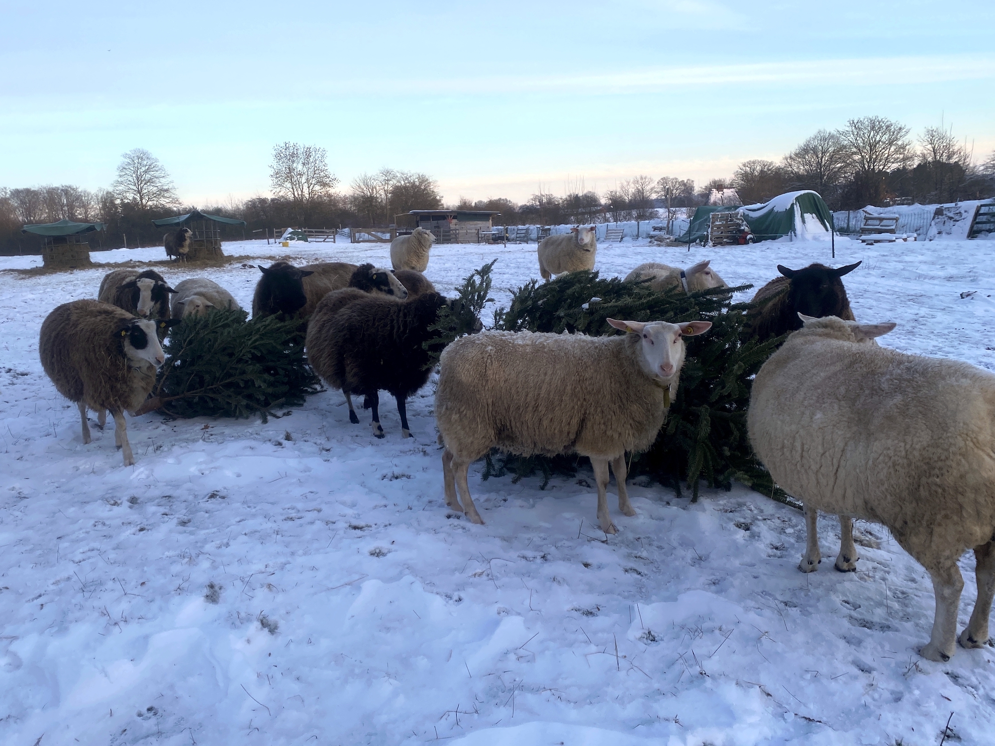 Etwas Abwechslung entpuppte sich einzig Mitte Januar. Die Jugendfeuerwehr hatte gegen eine kleine Spende die Weihnachtsbäume der Gemeindehaushalte eingesammelt und sie für das große Bikebrennen im Februar vor unserer Koppel gelagert. Hach, Schafe mögen Tannenknospen! Es gab also etwas zu knabbern und spielen. Und bald auch einen Raufenschutz vor dem eisigen, knallharten Ostwind. Also (für die Schafe) alles perfekt auf der Auen-Weide.