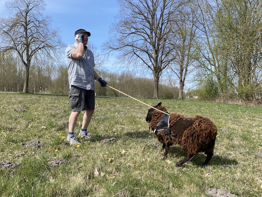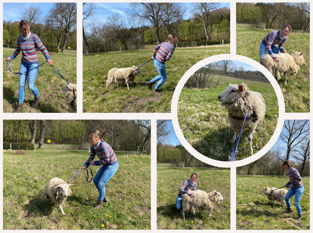 Bislang war es nie ein Problem, zu zweit eine Herde von über 50 Tieren von einer Weide auf die andere zu treiben. Bei der gestrigen Expedition liefen zunächst auch alle sechs Böcke freudig mit uns in die richtige Richtung. Erst, als die beiden angeleinten Nücker merkten, dass nichts Wolliges mehr hinter ihnen läuft, mochten sie nicht mehr so recht weiter. Der eine wollte zurück, der andere erblickte den Löwenzahn auf der nicht abgegrasten Wiese, die wir als Abkürzung nahmen, und wollte es sich nicht nehmen lassen, sich endlich mal alleine so richtig den Bauch vollzuschlagen.