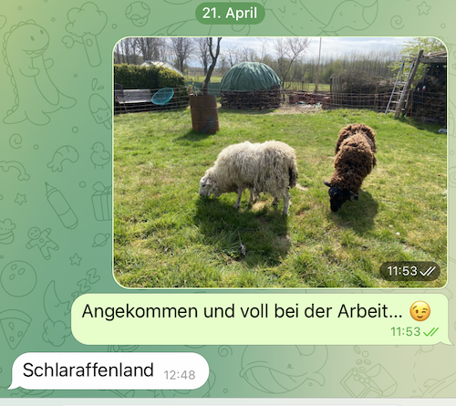 Frauchen dokumentierte die Ereignisse, enthedderte immer mal wieder einen Bock aus dem Zaun, auf den wir wider aller Ratschläge KEINEN Strom gelegt haben, und vor allem informierte sie alle Freunde, die es wissen wollten oder auch nicht, dass sie nun eine echte Schäferin ist... ;-)