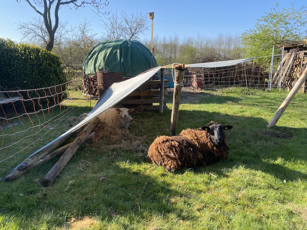Herrchen baute mit viel Liebe zum Detail - z.B. inklusive Schubberbaum - einen Unterstand für die Schafe.
