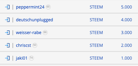 15 STEEM Diese werden unter den fünf Gewinnern mit den punkthöchsten Wörtern gestaffelt (5-4-3-2-1 STEEM) aufgeteilt und am Sonntag in Vests überwiesen. Alle Mitspieler werden darüber in einem Ergebniskommentar informiert.