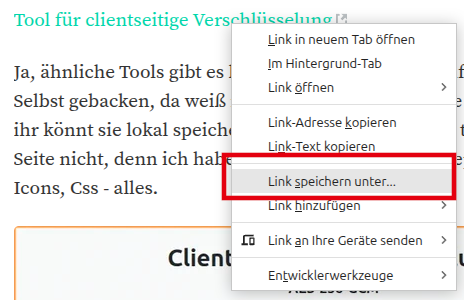 Rechtsklick auf den Link oben, mit Link speichern unter (beim Firefox heißt es Ziel speichern unter) die Datei encrypt.html abspeichern wo man will. Im Dateiexplorer oder auch direkt im Browser (bei mir: Datei - Datei öffnen) kann man die Seite dann lokal öffnen.