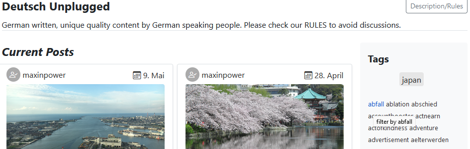 Mir gefällt die Tag-Anzeige noch nicht so richtig. Eigentlich soll man anhand der Schriftgröße die Häufigkeit des Vorkommens erkennen, aber dadurch dass "deutsch" und "steemexclusive" nahezu unter allen Posts erscheinen, ist der Unterschied so groß, dass die Tags, die nur unter 10 oder weniger Posts stehen, sich nicht mehr in der Größe unterscheiden...