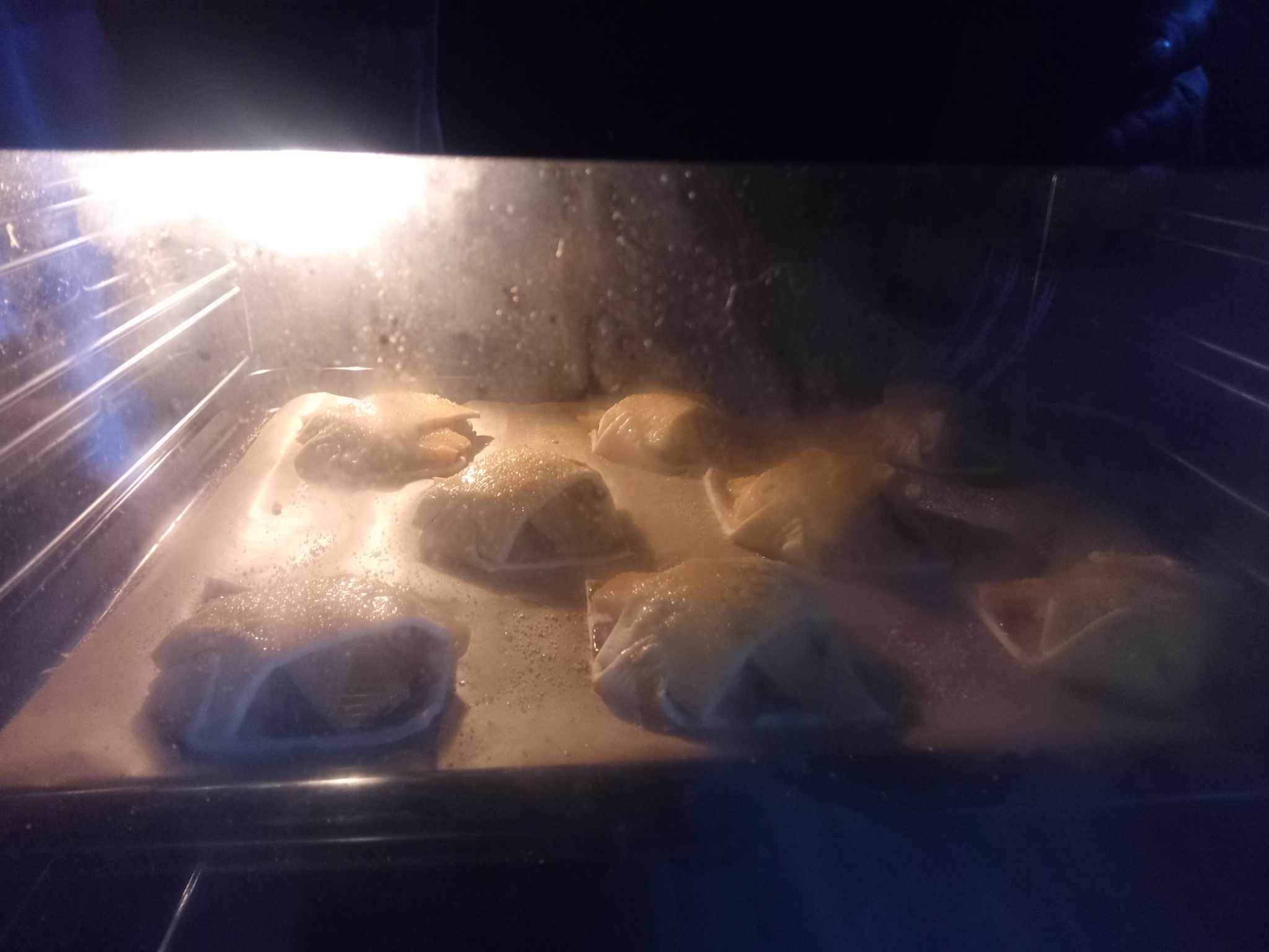 Placing the tray in the oven to bake for approx. 25 minutes at around 175-180°C. According to the chefkoch's recommendation: Difficulty level simple...