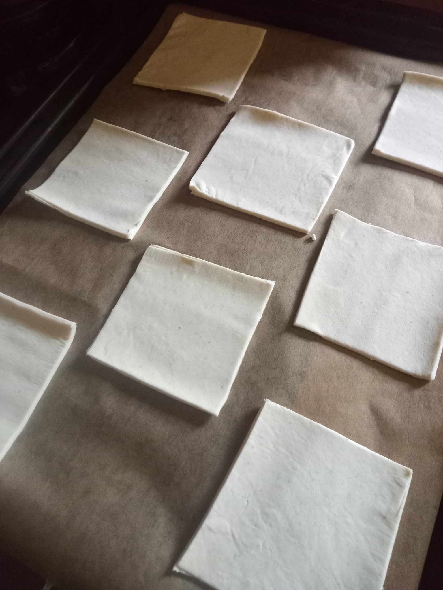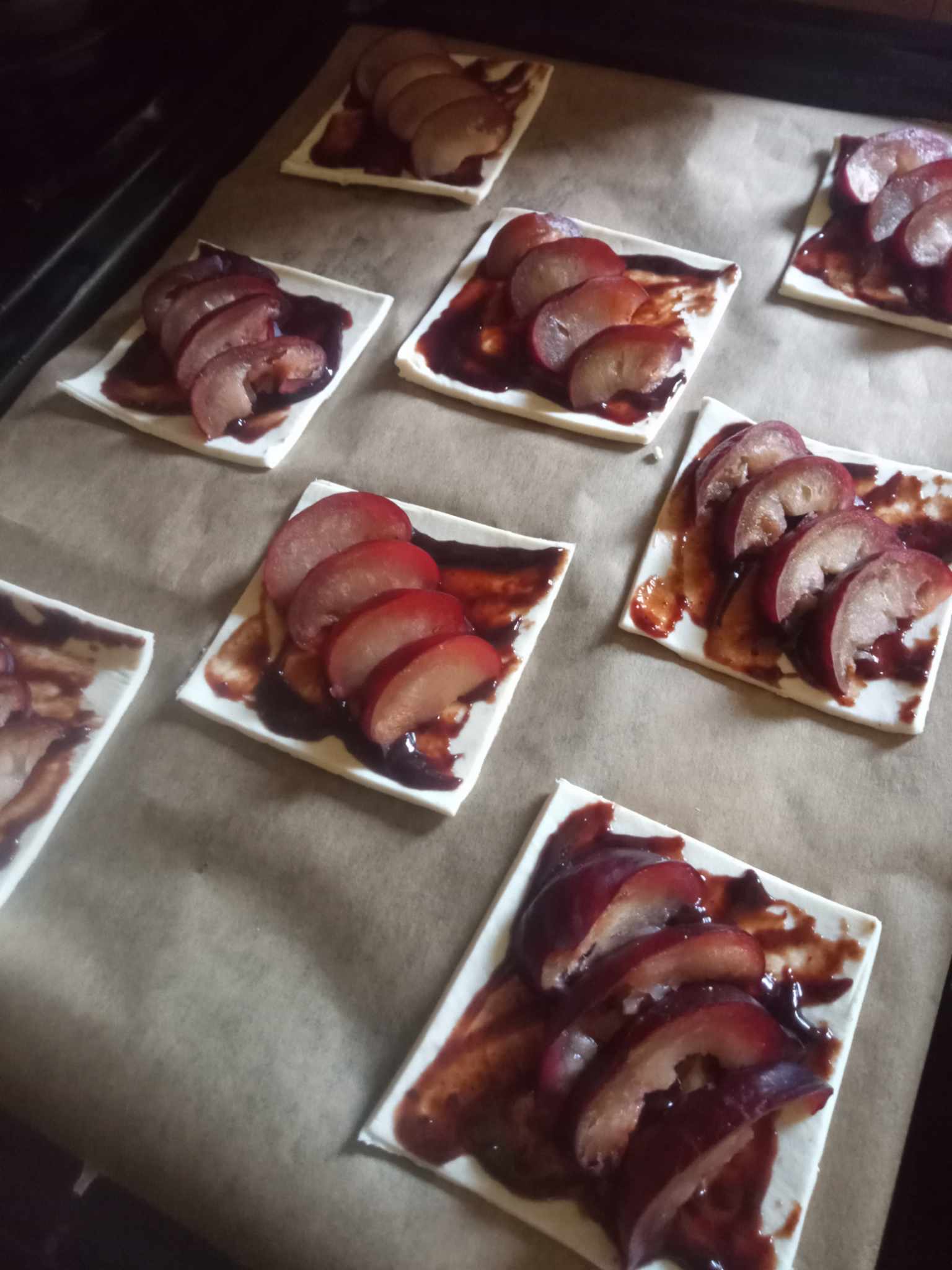 The pastry sheet was cut into small squares and spread on the baking tray. Each one was given a more or less thin layer of plum jam and then sweet but mealy plums cut into wedges.
