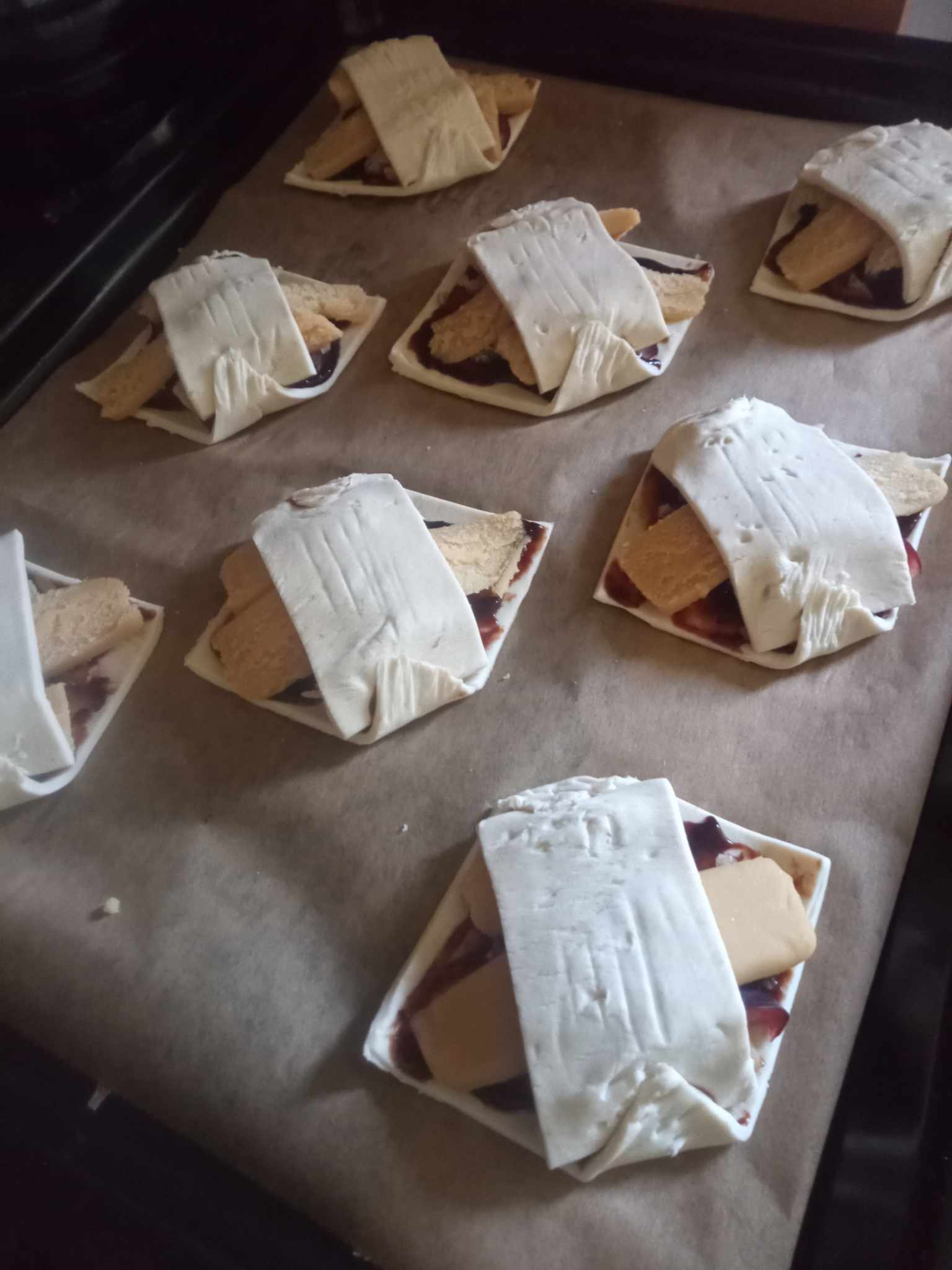 Finally, thin strips of puff pastry were placed on top as a lid and the corners glued together. The whole thing is best coated with either condensed milk or a mixture of egg yolk, cream and sugar.