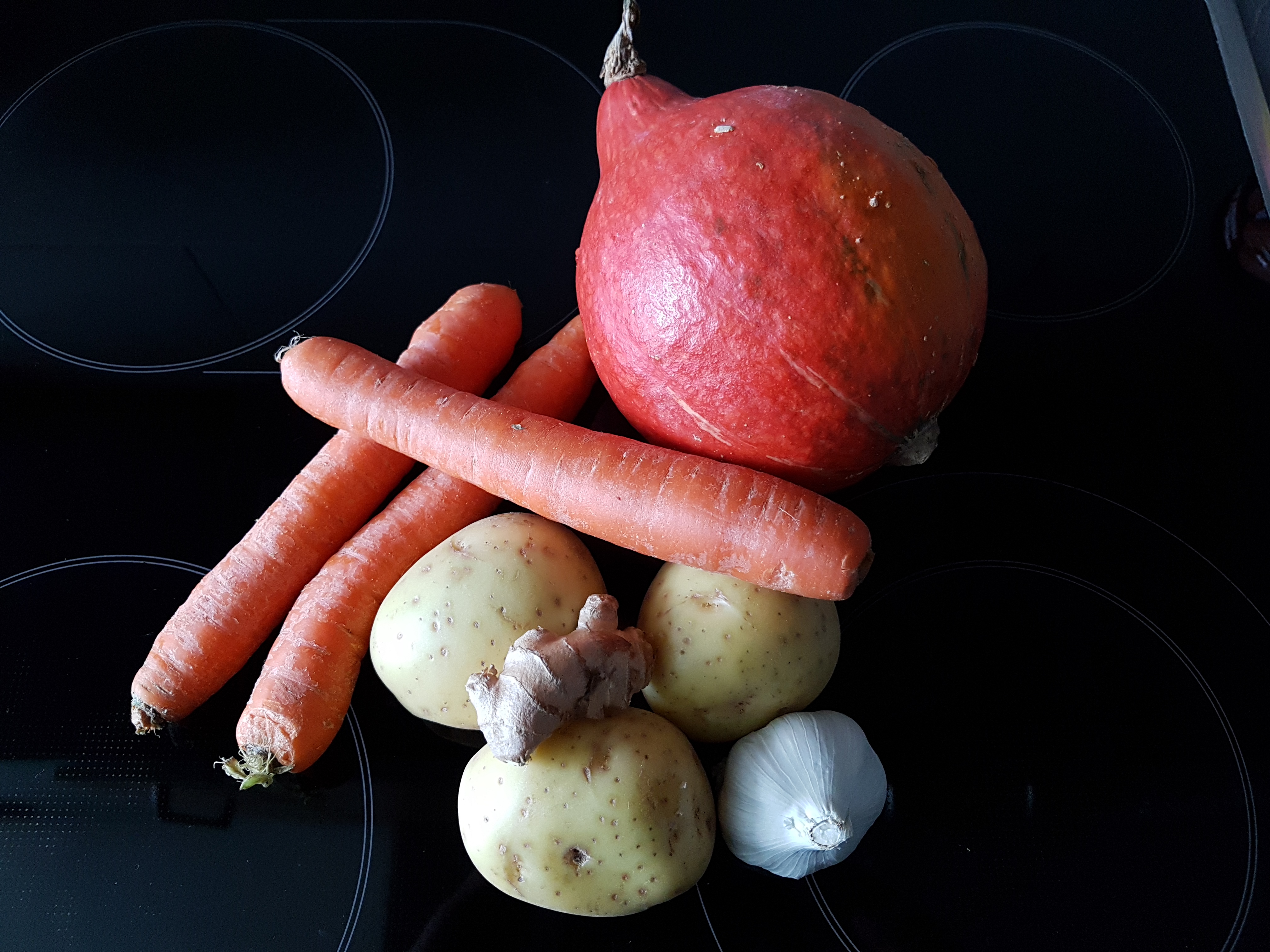 Ein Esslöffel Öl erhitzen, darin eine fein gehackte Zwiebel andünsten. Circa 500g gewürfeltes Kürbisfleisch ( Hokkaido, ungeschält ) und zwei kleingeschnittene Kartoffeln zugeben.