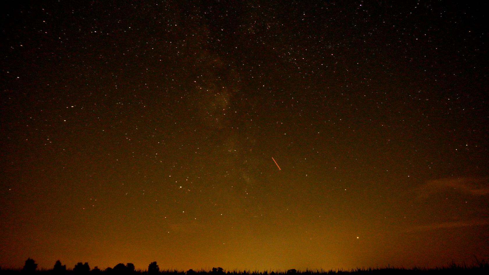 Dort angekommen stellte sich die Luft allerdings doch leicht diesig dar (zeige ich am Ende an einem Bild mit der Taschenlampe) und der Horizont hatte doch eine relativ starke Lichtaura - was eventuell vom, nicht so ganz weit entfernen Ort Sulingen her rühren könnte. Auch waren relativ viele Flugzeuge in der Luft - eins sieht man auf dem Bild oben.