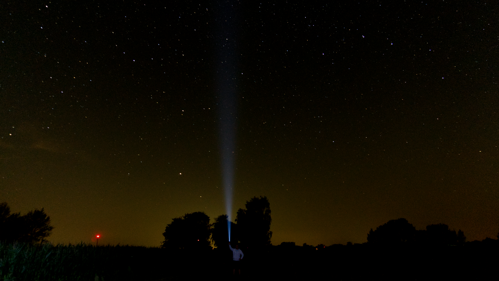 Hier sieht man gut den Strahl der Taschenlampe (Blickrichtung des Bildes ist nach West), nach Norden war es noch viel viel diesiger und der Lichtstrahl war dort noch deutlich intensiver zu sehen.
