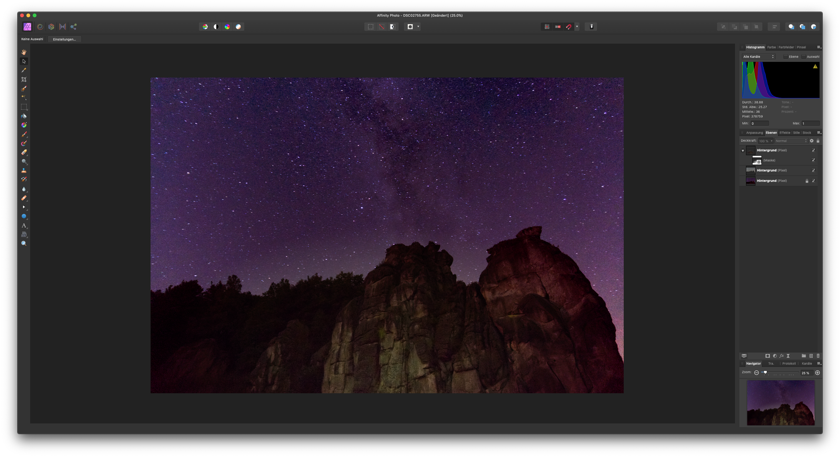 Dem Grunde nach geht es darum einerseits die Milchstraße herauszuarbeiten und den Vordergrund optimaler zu belichten. Daraus versucht man dann ein Bild zusammen zu setzen und per Weißabgleich und Sättigung die Komposition interessant zu gestalten.
