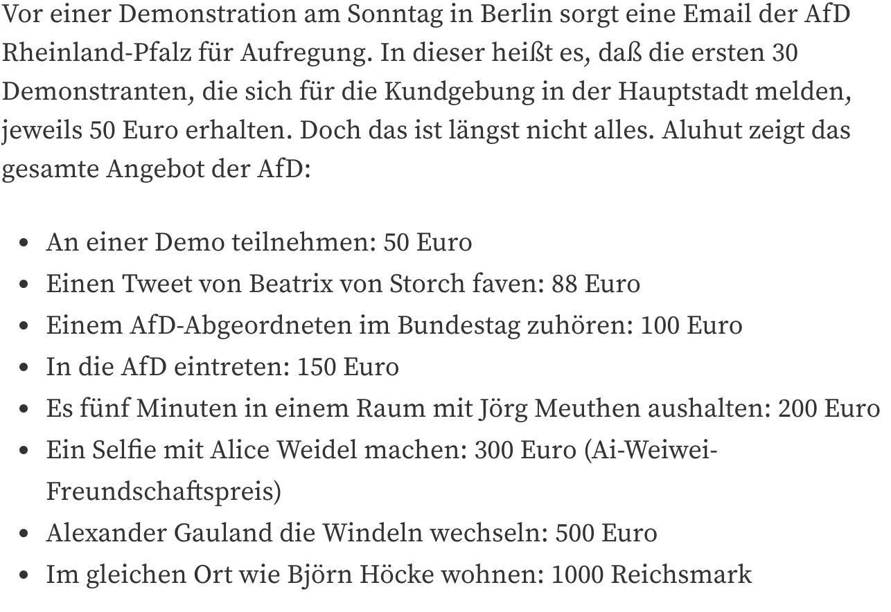 Eine Email mit der aktuellen Prämienliste der AfD-Faschisten wurde gestern geleaked und im Aluhut-Magazin wird heute ein Auszug daraus veröffentlicht. Die Hacker haben angekündigt im Laufe des Tages noch weitere Emails mit brisanten Inhalte zu veröffentlichen.